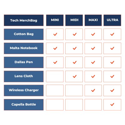 | Products Included: | Mini: Malta Notebook, Dallas Pen & Cotton Bag Midi: Malta Notebook, Dallas Pen, Cotton Bag & Microfibre Lens Cloth Maxi: Malta Notebook, Dallas Pen, Cotton Bag, Microfibre Lens Cloth & Wireless Charger Ultra: Malta Notebook, Dallas Pen, Cotton Bag, Microfibre Lens Cloth, Wireless Charger & Capella Metal Bottle |