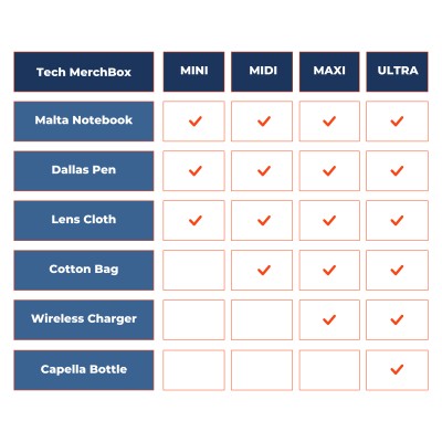 | Products Included: | Mini: Malta Notebook, Dallas Pen & Microfibre Lens Cloth, Midi: Malta Notebook, Dallas Pen, Microfibre Lens Cloth & Cotton Bag, Maxi: Malta Notebook, Dallas Pen, Microfibre Lens Cloth, Cotton Bag & Wireless Charger, Ultra: Malta Notebook, Dallas Pen, Microfibre Lens Cloth, Cotton Bag, Wireless Charger & Capella Metal Bottle |